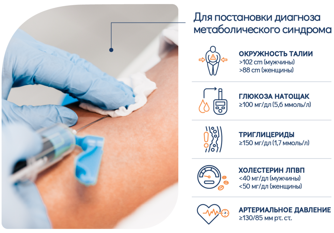 Для постановки диагноза метаболического синдрома необходимо наличие трёх и более метаболических маркеров